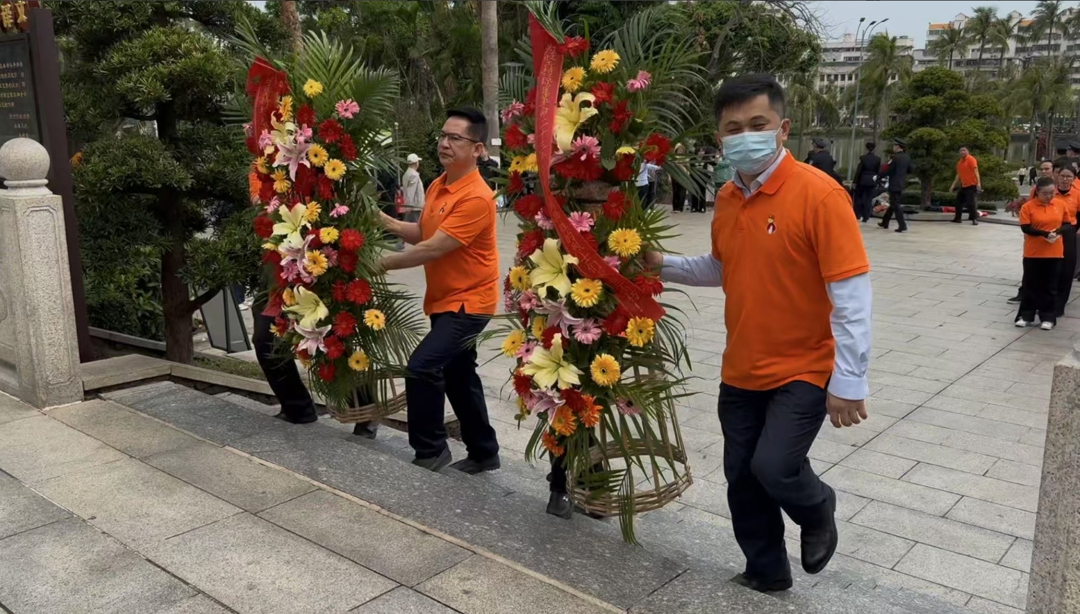 经过一段时间的等待才轮到森林舞会。森林舞会首先向烈士敬献花篮,花篮缎带上写着“为坚持琼崖革命23年红旗不倒牺牲的烈士们永垂不朽!”“为解放海南岛渡海牺牲的烈士们永垂不朽!”鲜艳的花篮寄托森林舞会对革命先辈的崇敬和哀思。